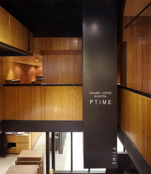 Brass handrails are used to separate the order section from the seating area. Customers may take a seat at the brass table and chair representing a vintage industrial style, or on the brass park bench, where they can take in all the nice views while enjoying a moment of tranquility and exquisiteness.