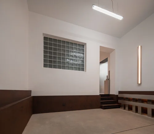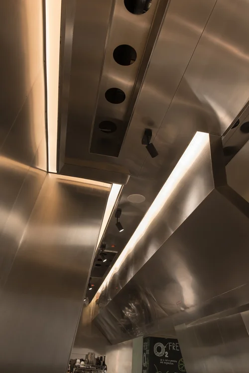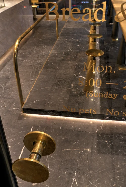The ceiling is largely covered by brass, so is the air conditioner outlet. Inside the bakery, there is one whole wall and one wall of 1.3m high that are made of dark stone materials. The rest remains original with aluminum framed windows.