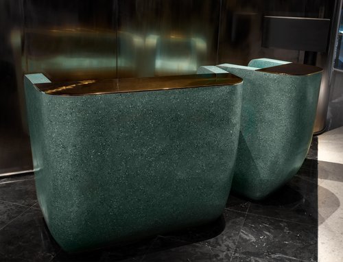 在动态的大理石的边缘,用铜结构作为勾勒线,嵌入大理石体块中,利用铜的造型缝合这一种动态;并且与大理石柜台上的铜制垃圾桶和纸巾盒做组合。