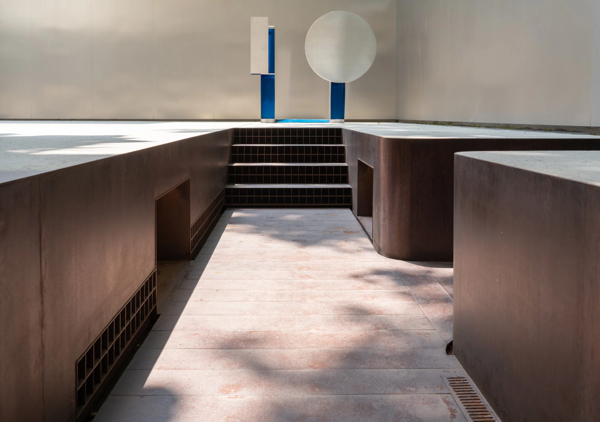 Brass handrails are used to separate the order section from the seating area. Customers may take a seat at the brass table and chair representing a vintage industrial style, or on the brass park bench, where they can take in all the nice views while enjoying a moment of tranquility and exquisiteness.